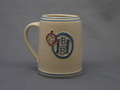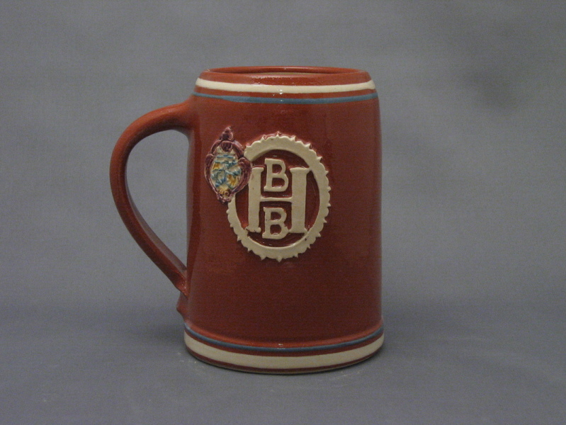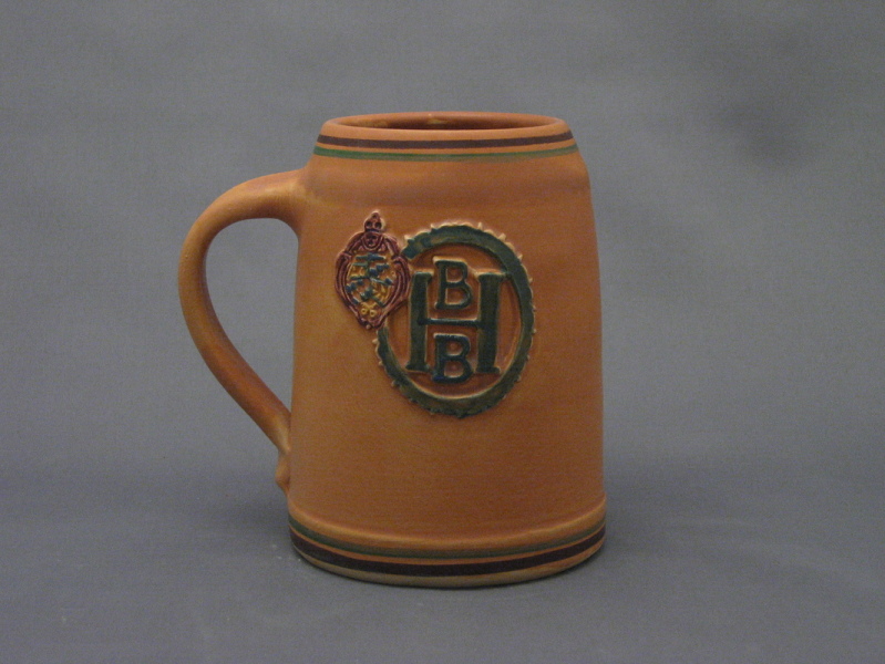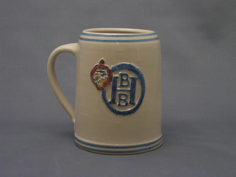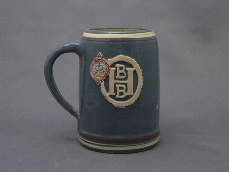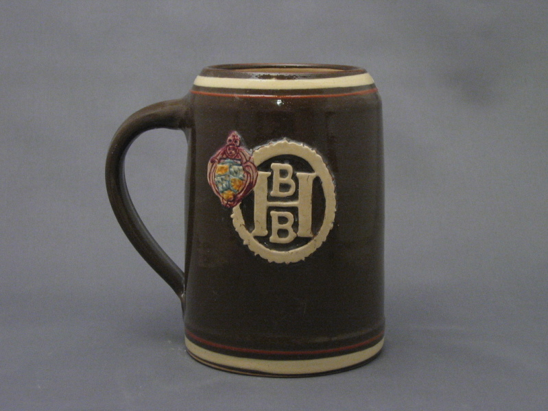 Seitlich vom Henkel plastisches Wappen des Hofbrauhaus Berchtesgaden. Oben und Unten Grüne und Braune Linien